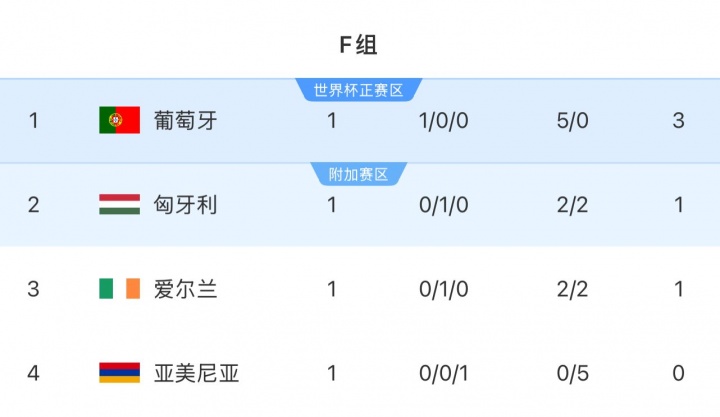 在欧洲预选赛中,F组还剩5场比赛,同一组的葡萄牙对手包括匈牙利,爱尔兰和亚美尼亚。